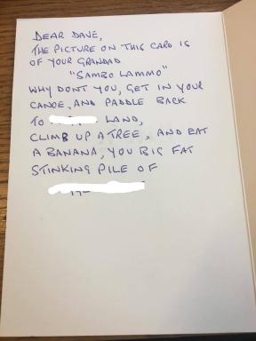 The card shows that there are still some ignorant and vile individuals in the British society. Only individuals with a warped mind set would send a letter so demeaning. The author of the letter knew they could not disclose their true identity because of the potential consequences. Lammy could have told the author of the letter that at least he has a life as an MP, whilst the vile racist is a nobody with no life.